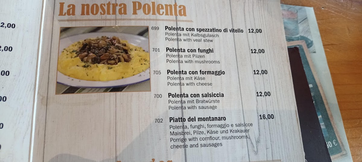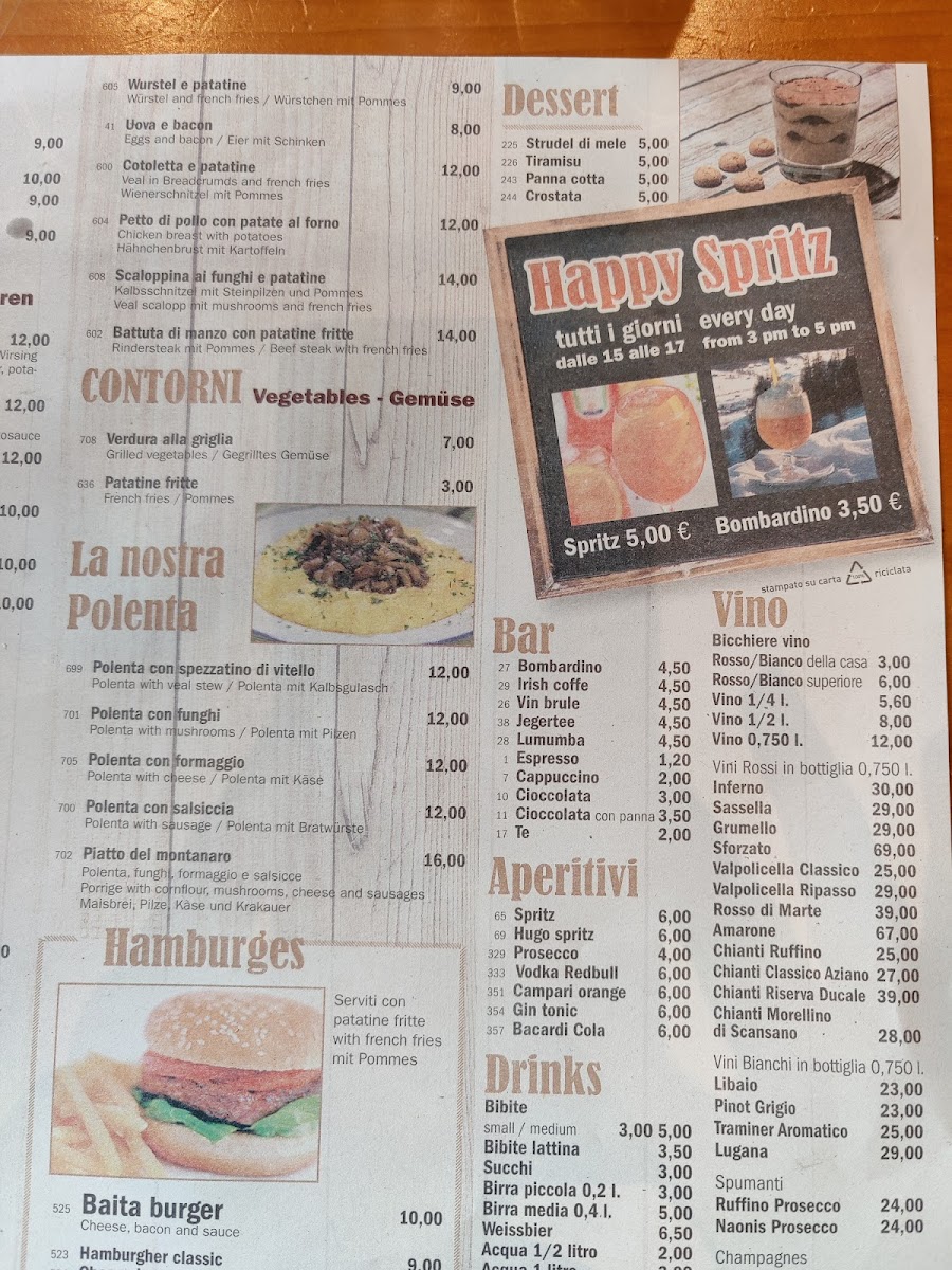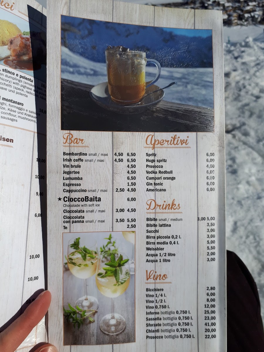 Viewed as a whole, the menu at Baita Berghütte feels like a concise yet well-curated reflection of Alpine comfort food and casual mountain dining, where simplicity and heartiness take priority. The savory offerings stand out with satisfying classics such as Beef, Carbonara Pasta, and Cestoviny All´arrabbiata, each delivering familiar Italian flavors that are rich, warming, and well-suited to the restaurant’s rustic setting. Traditional local dishes like Pizzoccheri, Polenta So Syrom, and Pollenta Con Spezatino Di Vitello highlight the kitchen’s focus on regional identity, combining polenta, cheese, and tender meats into filling plates that feel authentic and unpretentious. Lighter or shareable options such as Zuppa Al Pomodoro and Tagliere Do Salami balance the menu by offering comfort and variety, whether as a starter or something to enjoy alongside drinks. On the beverage side, the selection complements the food naturally, ranging from a strong Espresso to refreshing choices like Pivo and Aperitivo Con Prosecco, while the warming Bombardino adds a distinctly alpine touch that enhances the overall experience. Taken together, the menu does not try to be overly elaborate, but instead succeeds by focusing on well-known dishes prepared in a straightforward way, making it easy for diners to enjoy a complete, satisfying meal that aligns perfectly with the cozy mountain atmosphere of the restaurant.