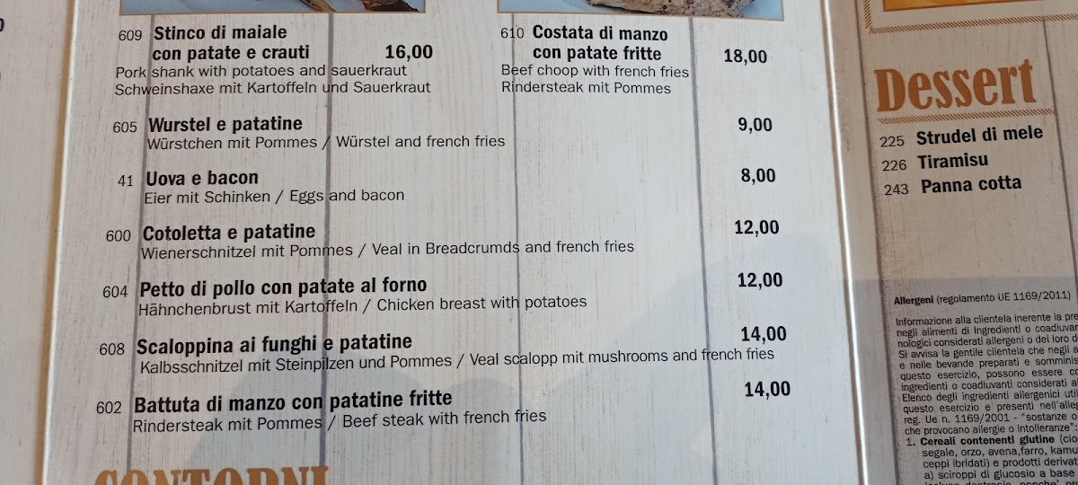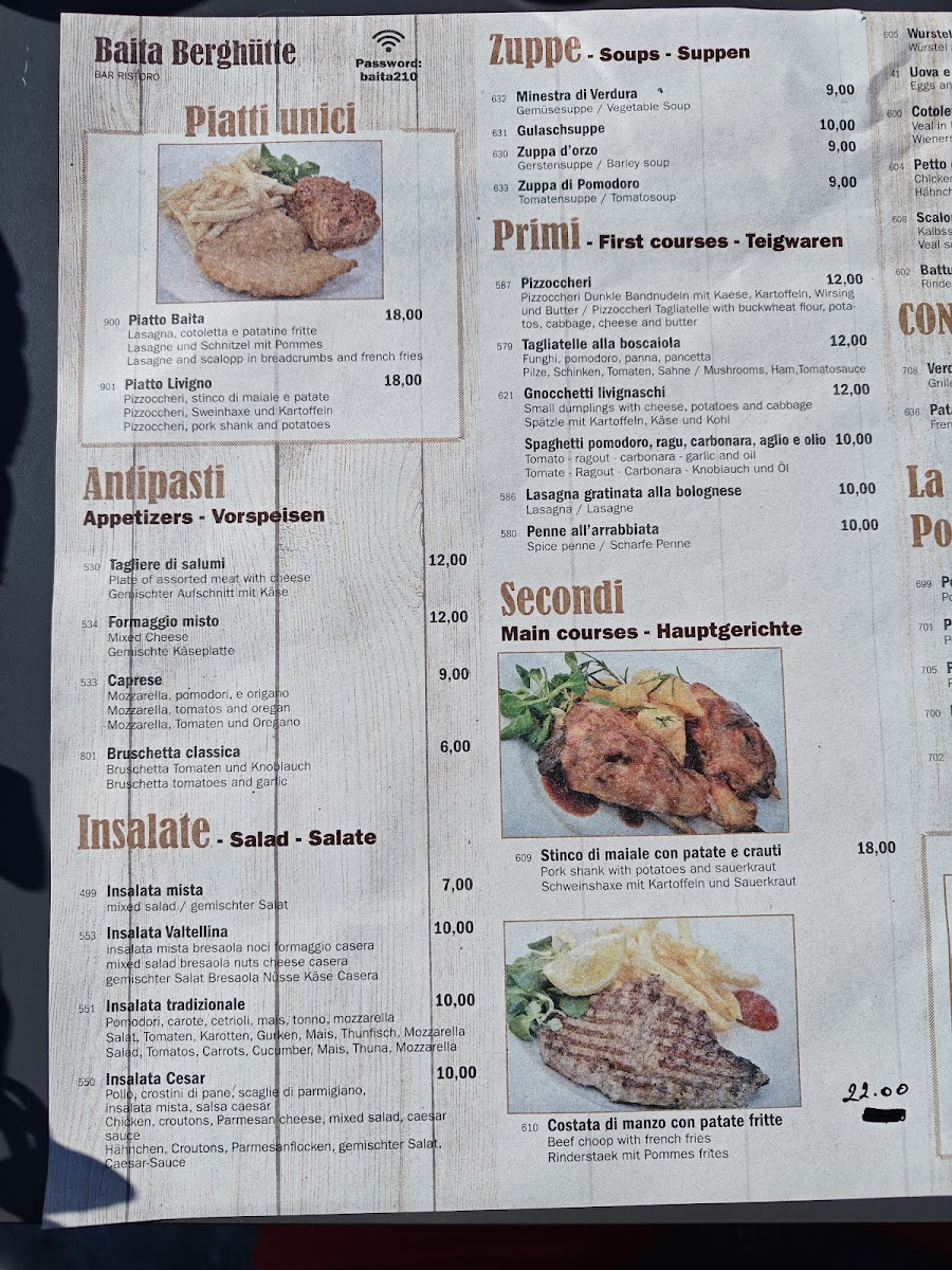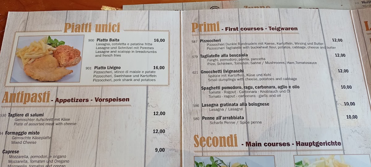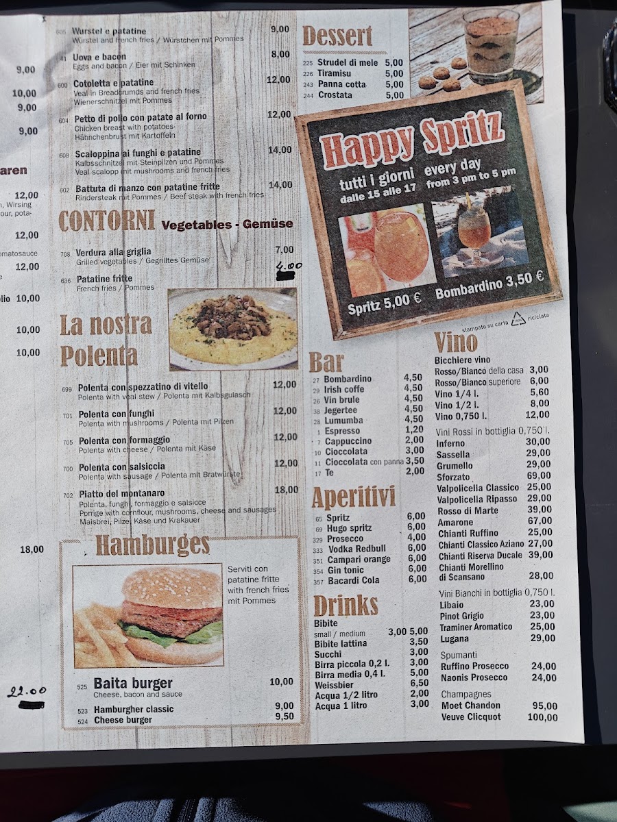 Viewed as a whole, the menu at Baita Berghütte feels like a concise yet well-curated reflection of Alpine comfort food and casual mountain dining, where simplicity and heartiness take priority. The savory offerings stand out with satisfying classics such as Beef, Carbonara Pasta, and Cestoviny All´arrabbiata, each delivering familiar Italian flavors that are rich, warming, and well-suited to the restaurant’s rustic setting. Traditional local dishes like Pizzoccheri, Polenta So Syrom, and Pollenta Con Spezatino Di Vitello highlight the kitchen’s focus on regional identity, combining polenta, cheese, and tender meats into filling plates that feel authentic and unpretentious. Lighter or shareable options such as Zuppa Al Pomodoro and Tagliere Do Salami balance the menu by offering comfort and variety, whether as a starter or something to enjoy alongside drinks. On the beverage side, the selection complements the food naturally, ranging from a strong Espresso to refreshing choices like Pivo and Aperitivo Con Prosecco, while the warming Bombardino adds a distinctly alpine touch that enhances the overall experience. Taken together, the menu does not try to be overly elaborate, but instead succeeds by focusing on well-known dishes prepared in a straightforward way, making it easy for diners to enjoy a complete, satisfying meal that aligns perfectly with the cozy mountain atmosphere of the restaurant.